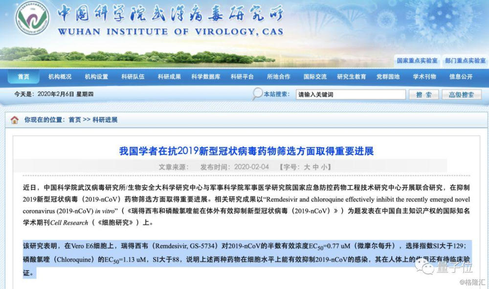 2月4日,中科院武汉病毒研究所官方消息称,在抑制2019新型冠状病毒(2019-nCoV)药物筛选方面取得重要进展,相关研究成果已经发表在了Cell Research(《细胞研究》)上。