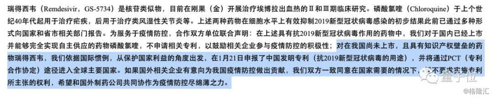 对在我国尚未上市,且具有知识产权壁垒的药物瑞得西韦(Remdesivir),我们依据国际惯例,从保护国家利益的角度出发,在1月21日申报了中国发明专利(抗2019新型冠状病毒的用途),并将通过PCT(专利合作协定)途径进入全球主要国家。