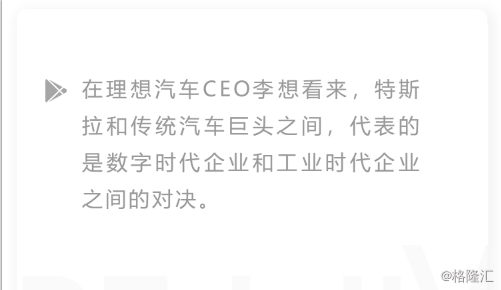 在理想汽车CEO李想看来,特斯拉和传统汽车巨头之间,代表的是数字时代企业和工业时代企业之间的对决。他指出,当出现生产力维度差异的时候,永远投资高一个维度中最靠谱的那个创始人,哪怕这个企业看着还很弱小。