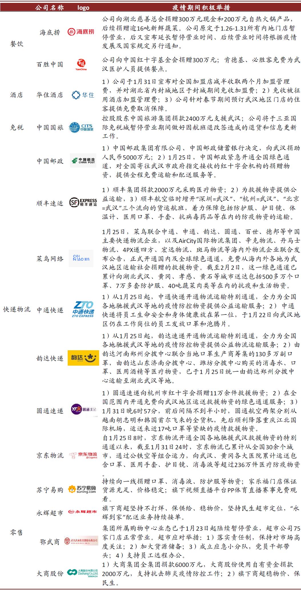 ► 这些行业直接服务于消费者,疫情中受损最为严重,但很多公司都积极捐款捐物、承担疫情期间的员工工资。目前这些行业普遍面临的困境是:营业停滞,收入直线下降,正常发放工资、支付租金的情况下,固定性成本并未降低。如果得不到帮扶,很有可能影响到工资发放和用工数量。另一方面,业内企业捐款捐物,奋战在外卖加工配送、保障食品日用品消费、物流配送第一线,门店及时停业,延长假期,支付员工假期工资,关怀员工家属的各项需求。