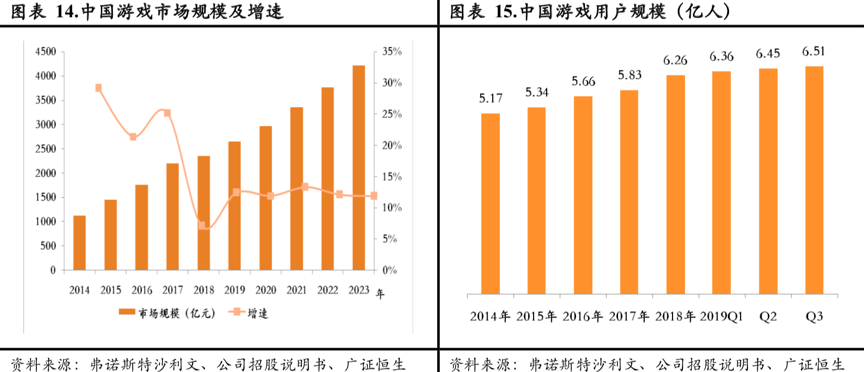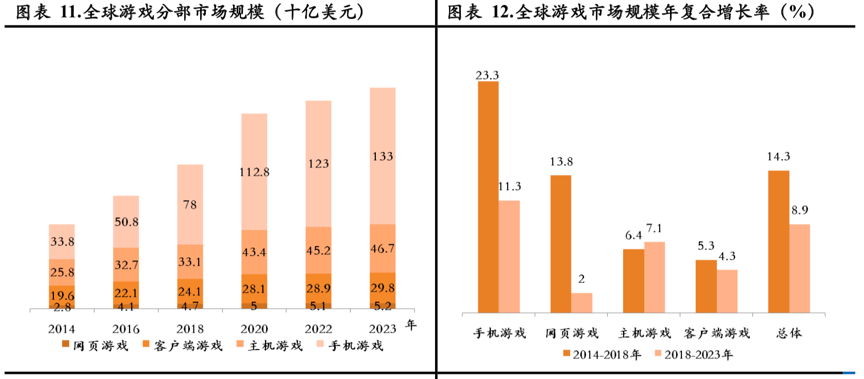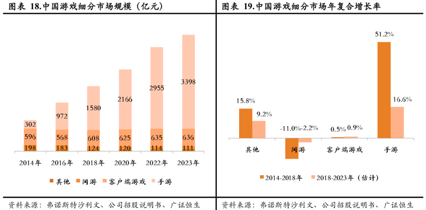 再看中国市场。2018年,中国已经成为全球最大的游戏市场,2018年市场规模已达2357亿元,拥有巨大的体量。尽管在2018年后,随着步入成熟期,中国游戏市场整体收入增速开始放缓,但预计2019-2023年内仍有望维持12.3%的年复合增长率。
