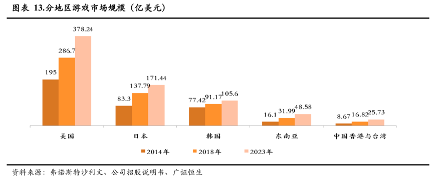 全球市场看,游戏行业仍然是朝阳阶段,全球市场规模维持高景气度。根据弗若斯特机构报告,2014-2018年全球游戏市场年复合增速约为14.3%,而手游市场表现抢眼。世界各国家和地区间,美国和中国是全球最大的游戏市场,而东南亚市场或是地区中最具未来潜力的地区。