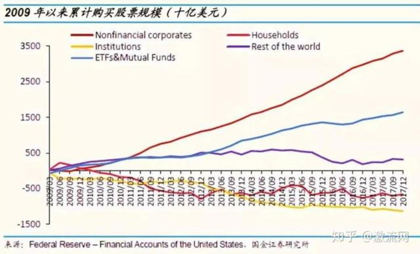 的股票市场的基本特征是:买入股票价格上涨,卖出股票价格下跌。要支撑股票价格上涨,必须有大量的买单,在美股市场中大笔买入股票的究竟是哪些人呢?美联储的数据显示,从2009年初至2017年末,美国非金融企业累计购买了3.37万亿美元的股票,ETF和共同基金累计购买了1.64万亿美元的股票,而美国家庭和机构分别净出售了6557亿美元、1.14万亿美元的股票,最大的买家其实是美国上市公司自身!