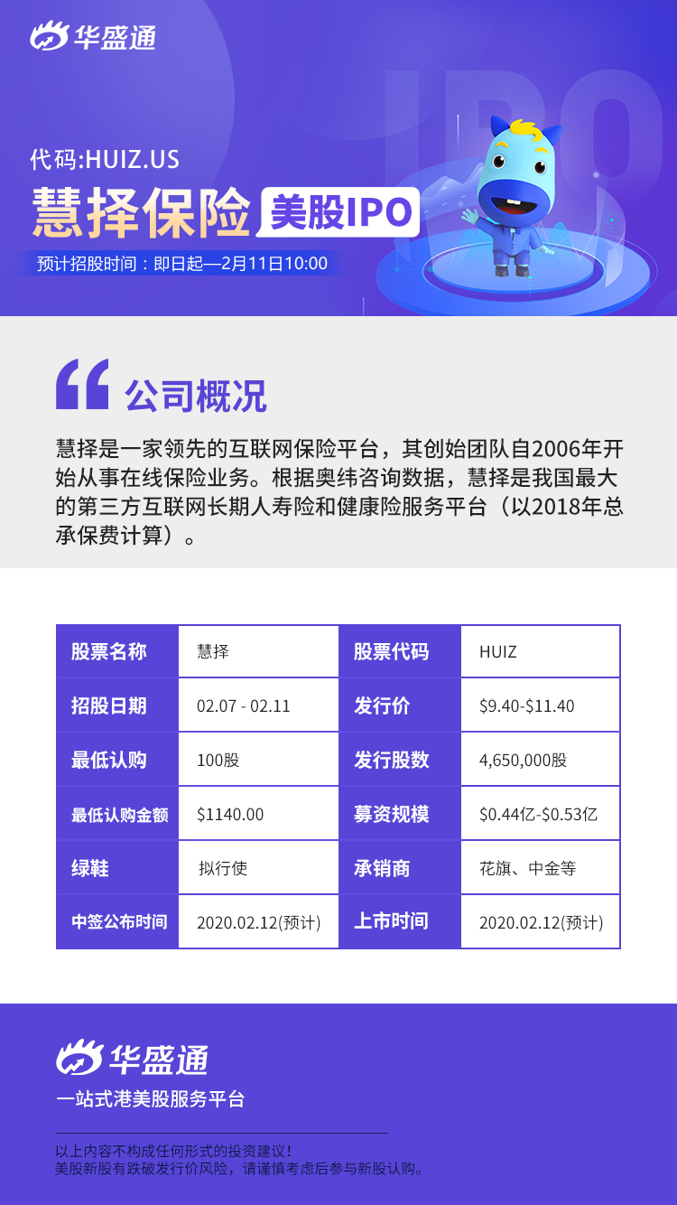 华盛资讯2月7日讯,国内领先互联网产品及服务平台:慧择保险今日正式开启招股进程。