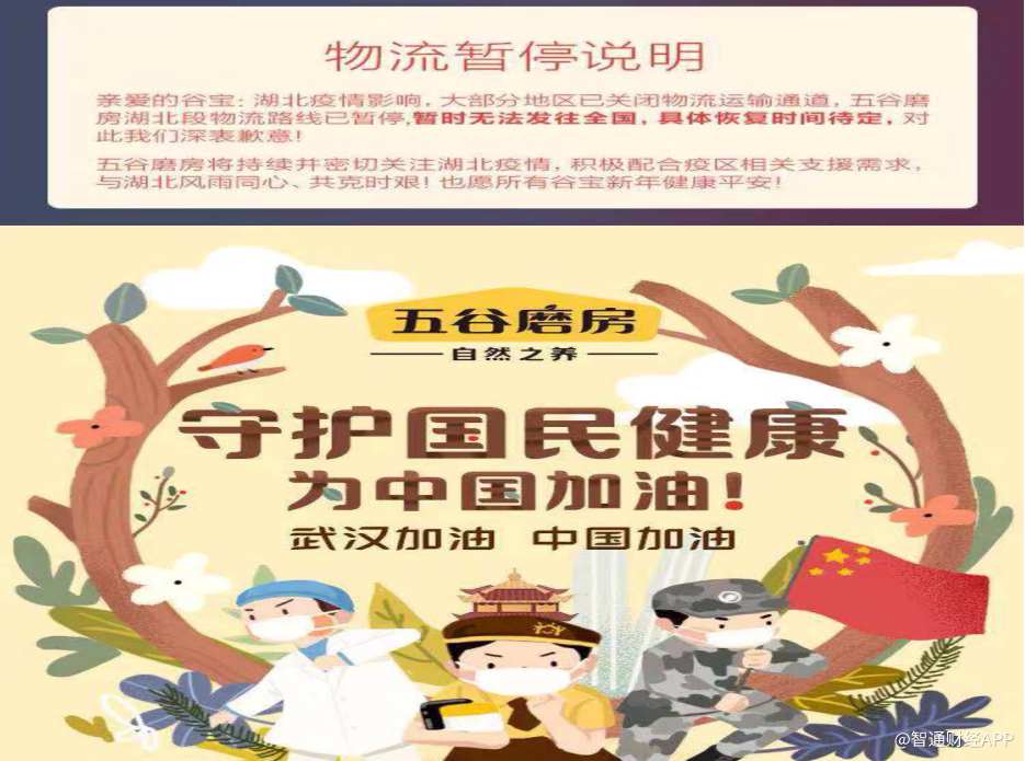 截至2019年6月30日,五谷磨房线上渠道则主要包括天猫、京东、唯品会及微信会员店等电商平台,注册会员人数超过2280万。问题是,当下五谷磨房并不能保证物流畅通。智通财经在五谷磨房天猫官方旗舰店了解到,该店已经发布《物流暂停说明》,该说明表示受到湖北公共卫生事件影响,大部分地区已关闭物流运输通道,五谷磨房湖北段物流路线已暂停,暂时无法发往全国,具体恢复事件待定。此外,五谷磨房京东自营店客服人员向智通财经表示,店内商品可以发货,但发货时间无法保证。