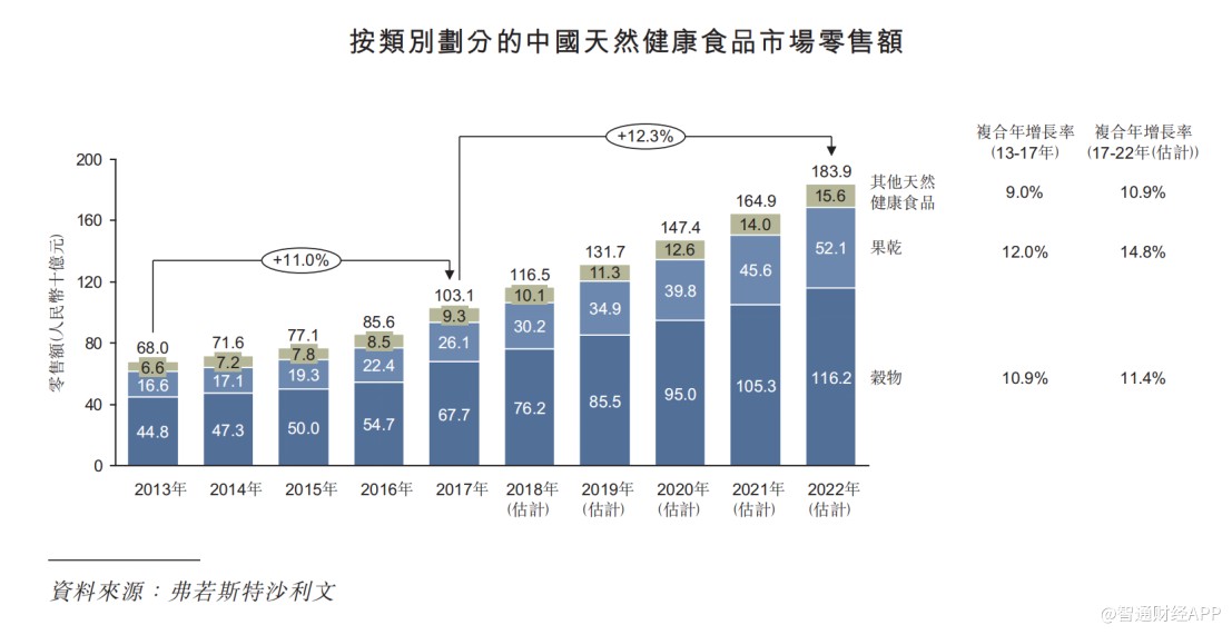 长期来看,随着人们健康意识的提升,中国的天然健康食品市场仍将保持高速发展。根据弗若斯特沙利文报告,按类别划分的中国天然健康食品市场零售额在2017年达到1031亿元人民币,预计到2022年增长至1839亿元人民币,期间将以12.3%的复合增长率增长。