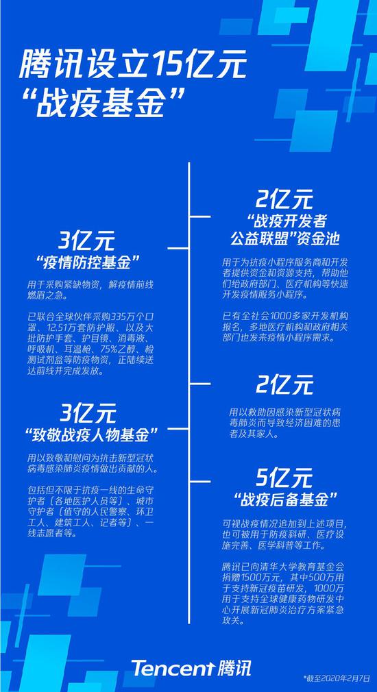 2月7日晚间消息,刚刚,腾讯宣布设立15亿元“抗击新型冠状病毒感染肺炎疫情综合保障基金”(以下简称战疫基金)。