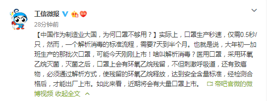 工信部官微回应,实际上,口罩生产秒速,仅需0.5秒/只,然而,一个解析消毒的标准流程,需要7天到半个月。也就是说,大年初一加班生产的那批次口罩,可能今天刚刚上市!