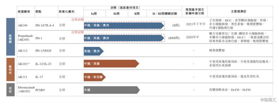 康方生物科技在聆讯资料集中表示,AK104是公司的新型的、潜在首创的PD-1/CTLA-4双特异性抗体。这是一种可同时靶向PD-1和CTLA-4的双抗候选药,目前正在中国和澳洲进行多种适应症的Ib/II期及II期临床试验,并正在美国启动一项临床试验。