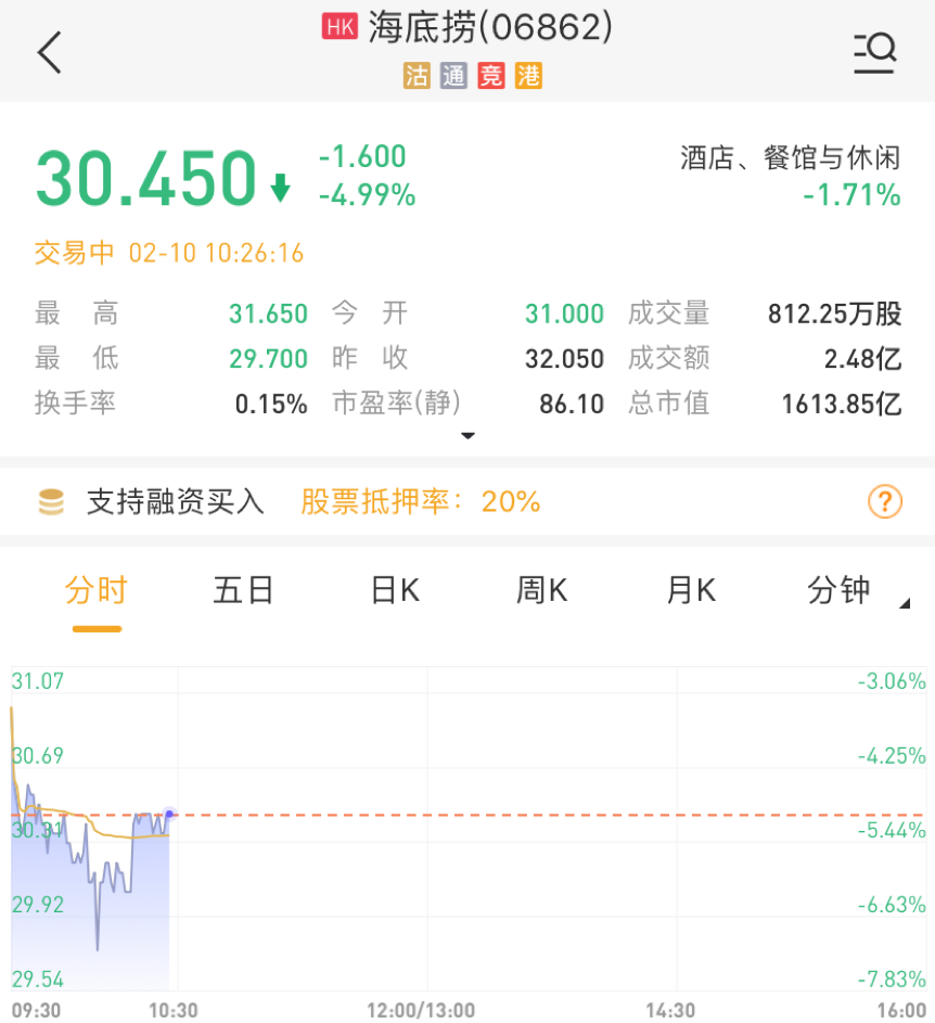 华盛资讯2月10日讯息,受疫情影响,海底捞(06862)盘中一度大跌逾7%。截至发稿,海底捞大跌4.99%,现报30.45港元每股,当前成交量812.25万股,成交额2.48亿港元,换手率为0.15%,当前总市值为1613.85亿港元。