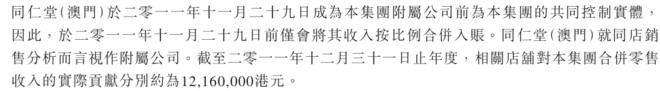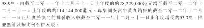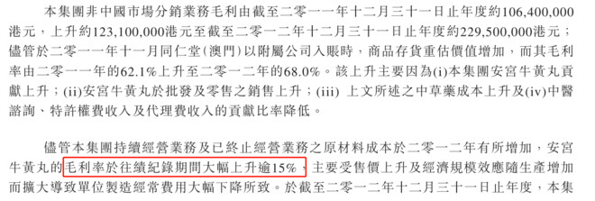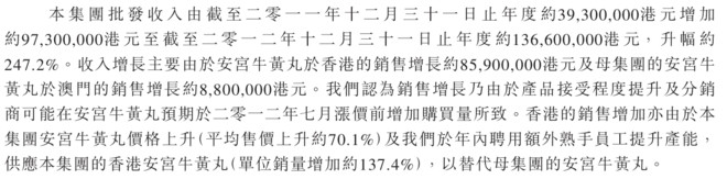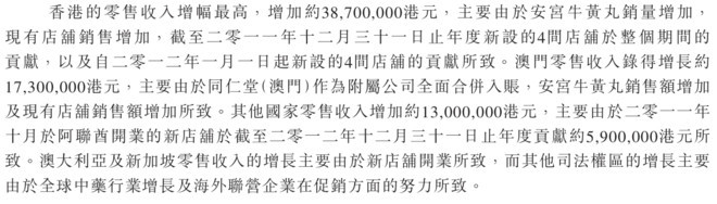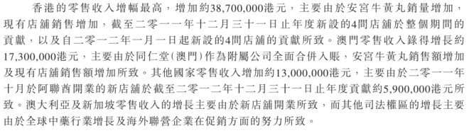 2012年,母公司在澳门销售安宫牛黄丸的收入80.9%,其中2011年以前开的店价增长34.8%,带动澳门现有店铺增长14200千港元;(这个数据算不出啥)