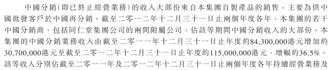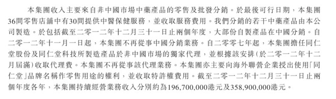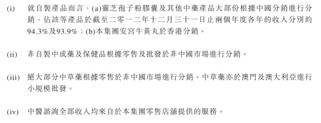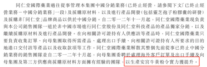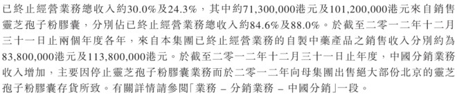灵芝孢子粉在内地的分销是已终止业务中占比最大的产品,高达88%,以前是公司自己批发到内地和关联公司;上市后,国药必须先卖给同仁堂集团,再进行分销。