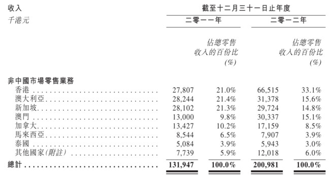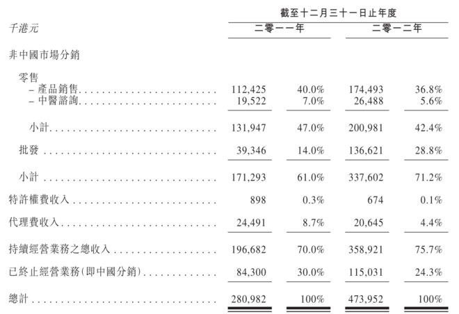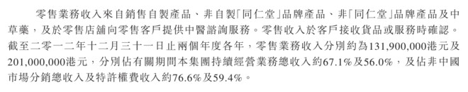 零售业务主要包括自制产品+非自制同仁堂产品+非同仁堂品牌产品+中草药+中医咨询服务,主要销售地区包括香港(33.1%)、澳大利亚(15.6%)、新加坡(14.8%)、澳门(15.1%)、加拿大(8.5%)。