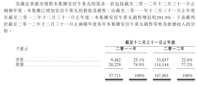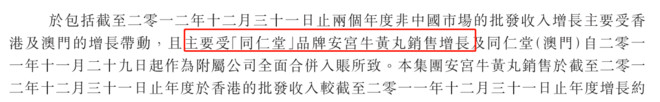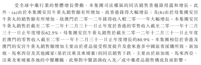 2012年香港的增长主要由于安宫牛黄丸的销售额大增所致;其中香港安宫牛黄丸销售额增长62.5%,