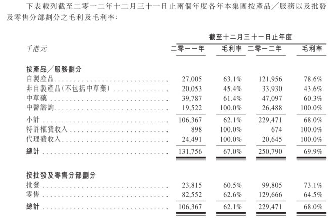 批发业务主要来自于香港,2012年85.9%的批发收入来自于香港,只有10%来自于澳门,2012年澳门同仁堂收入已经并表,根据招股书236页,澳门的批发主要是中草药等其他产品,猜测是因为同仁堂的厂在香港,所以自制产品安宫牛黄丸的批发收入全部来自于厂的所在地,然后再由经销商卖去澳门等地方。