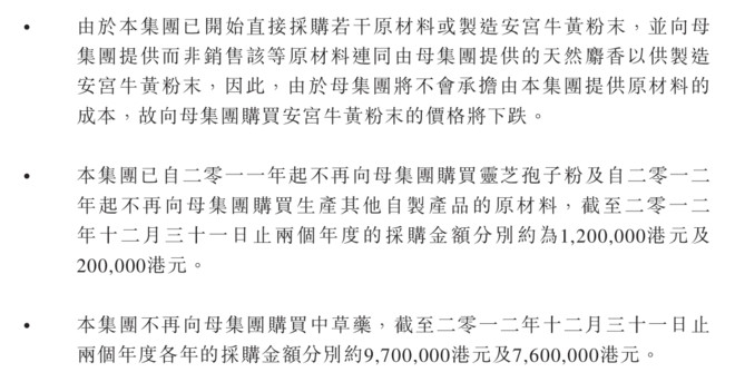 根据招股书202页的记录,同仁堂国药已经开始自己采购安宫牛黄丸粉末的原材料,然后把原材料提供给母集团,由母集团提供麝香然后做成粉末给回国药,所以这里头原材料的价格有很大部分是不包括在关联交易额中的。而且根据表述,国药也在自己制造安宫牛黄粉末。所以我认为该数值的比例不太稳定,不具备计算意义,因为13年以前的数据和13年以后的数据完全不同,而13年以后每年的数据也可能完全不同。
