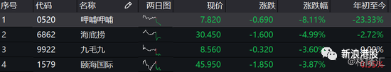 就餐饮业来看,1月20日肺炎疫情恶化以来,呷哺呷哺跌25.2%,海底捞跌13.74%,九毛九跌16.73%,颐海国际跌13.37%。
