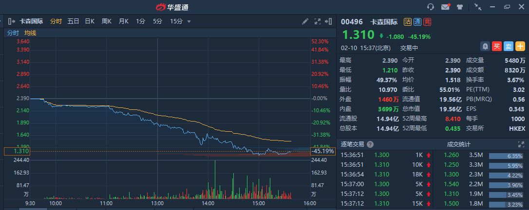 智通财经APP获悉,卡森国际(00496)近期加速下挫,股价暂现六连阴,本月累计跌幅超六成。截至发稿,跌45.19%,报1.31港元,成交额8320万港元。
