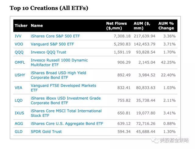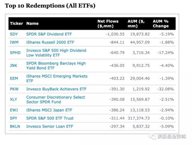 从资金流出来看,道富标普红利基金SDY居前,净流出10亿美元资金,小盘股的罗素2000基金IWM也有超8亿美元流出,而在IVV和VOO大举吸引资金的时候,ETF之王SPY却净流出了3亿美元资金。