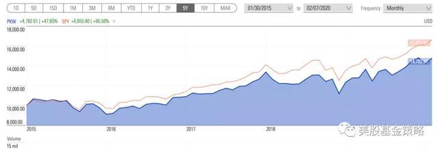 不过,从近几年走势来看PKW的表现较为弱势,与SPY距离较大。
