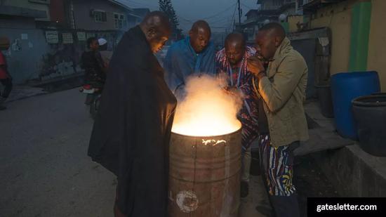 ▲在尼日利亚的拉各斯,人们在火边围成一团。