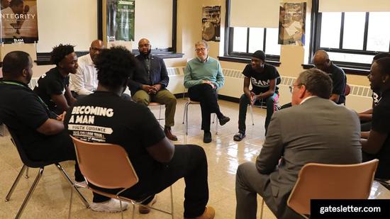 ▲比尔与芝加哥北格兰德中学的学生会面。