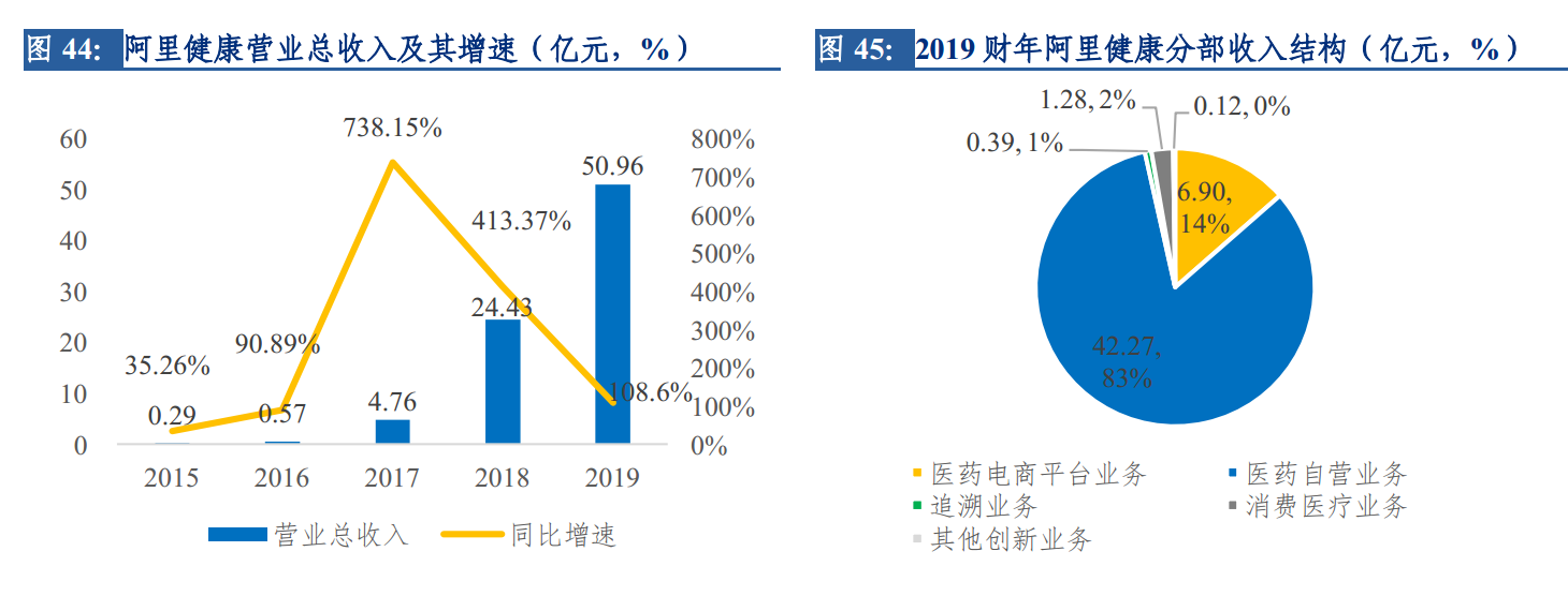 2019 财年,阿里健康实现营业总收入50.96 亿元,同比增长 108.6%,其中医药自营业务收入保持强劲,实现收入 42.27 亿元,同比增长 91.3%,占营业总收入的 83%左右;