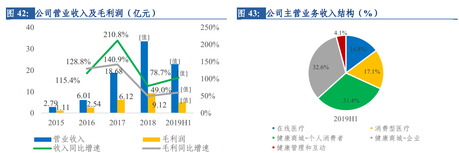 2019 年上半年四大主营业务中,健康商城业务两大收入板块(面向个人消费者和企业)占比均超过30%,其余三项业务收入占比均不足 20%,依靠产品销售和平台佣金,健康商城成为公司生态系统变现的重要渠道。