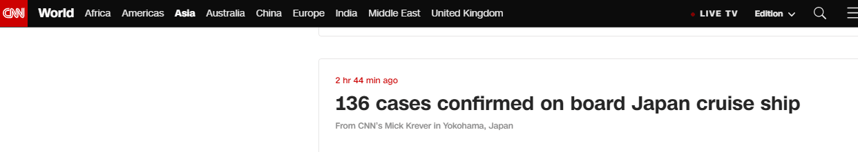 原标题:“钻石公主”号邮轮新增确诊病例66例,累计病例达136例