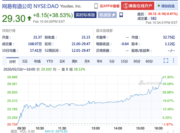 新浪科技讯 北京时间2月11日凌晨消息,周一收盘,网易有道暴涨38.53%,报29.3美元,市值达32.75亿美元。