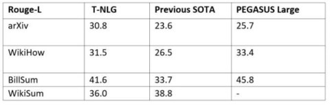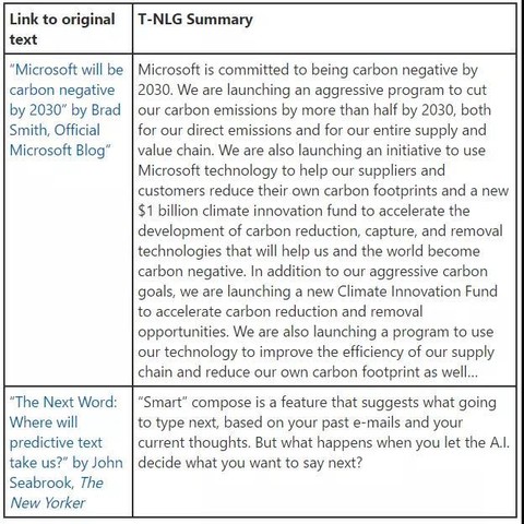 其中需要注意的是,Turing-NLG 采用多任务模式进行了训练,即在所有数据集上进行了同步训练。而众所周知,ROUGE评价指标在摘要任务方面存在一定的缺陷,因而在下表中展示了Turing-NLG 模型对一些公开文章输出的摘要内容以供参考: