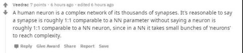 也有评论将讨论引入了复杂的生物学:人类神经元是其数千个突触的复杂网络。合理地说,突触与NN参数可比约为1:1,而神经元与NN神经元可比约为1:1,因为在NN中,需要一小束“神经元”才能达到复杂性。