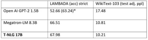 相同条件设置下,Turing-NLG 模型和Open AI 的GPT-2 、Megatron-LM 模型在标准语言任务上的性能指标——WikiText-103 困惑度(越低性能越好)、LAMBADA 下一个词的预测准确度(越高性能越好)的对比情况如下表:
