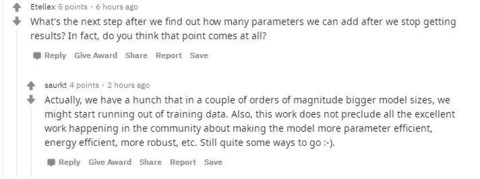 跟帖最高的一条评论是这样说的:幸好是170亿个参数,而不是170亿个超参数。当前最智能的机器有着超过100万亿的参数(他这里说的是人类),并不否认效率也很重要,但是在资金充足的情况下,参数多一些并没有什么错呀。