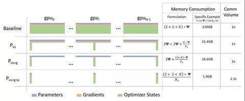 图注:与标准数据并行基准相比,ZeRO的三个阶段节省的内存和通信量。其中Ψ表示模型中参数的数量,K是优化器特定的常数项。