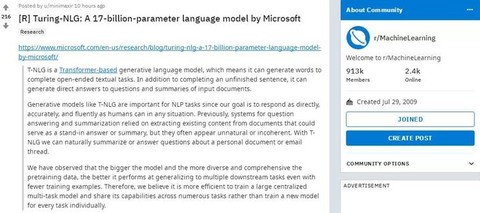 至于这自带170亿参数的Turing-NLG模型,也在社交媒体上引起了不少讨论,Reddit的“r/MachineLearning”版面中,仅仅10个小时,相关话题热度已经达到了216,70多人发表了看法。