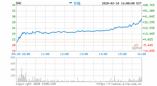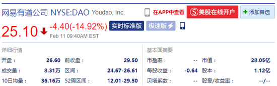 新浪科技讯 2月11日晚间消息,中概股网易有道跌14.92%,上一交易日教育股涨幅扩大,网易有道收涨近40%。