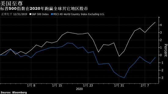 截止周一为止,标普500指数今年来上涨了3.8%,但除美国以外的MSCI世界指数却下跌了1.1%。即便创出纪录新高的斯托克欧洲600指数也比标普500指数落后逾1.6个百分点。