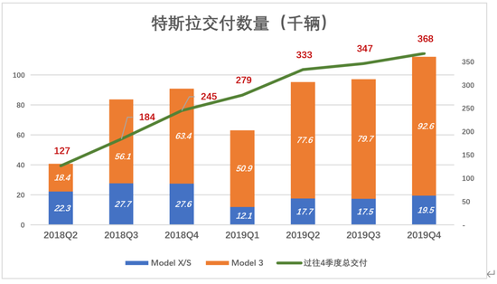 2019年Q4,特斯拉交付量达到11.2万辆,包括1.95万辆Model X/S和9.26万辆Model 3。