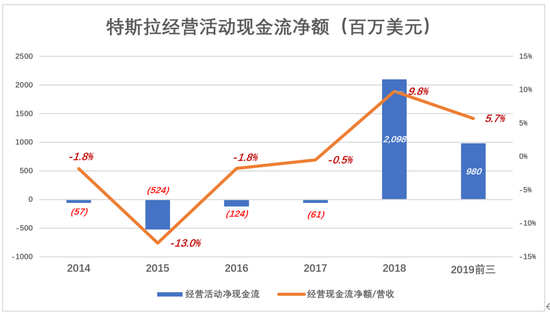 2018年,经营活动现金流由负转正,而且高达21亿美元,相当于营收的9.8%; 2019年前三季,经营活动现金流净额为9.8亿美元,相当于营收的5.7%。