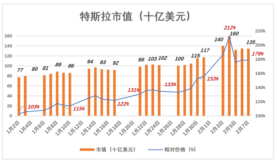 2020年刚刚过去1个多月,特斯拉股价的剧烈波动已经可以载入史册。以2019年12月31日收盘价(418.33美元)为基准,特斯拉9个交易日就涨了29%、19个交易日涨了39%、到第23个交易日(2月4日)累计上涨112%,市值达到1597亿美元;而在第24个交易日,特斯拉市值蒸发274亿美元,较2019年收盘价的涨幅收窄至76%。