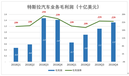 售价低的Model 3占比超过80%,无论是否降价,特斯拉毛利润率始终保持在18%以上。2018年、2019年毛利润分别为40.3亿和40.7亿。