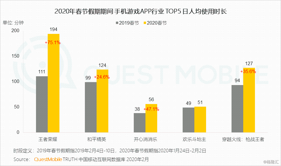 8.3 用户的使用时长也随之水涨船高,其中王者荣耀较去年春节期间增长近75%,其他吃鸡类游戏和休闲类游戏也都表现不俗