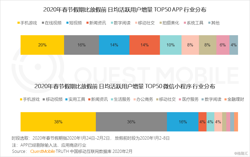 3、在用户规模增量方面,手机游戏、视频等领域受益明显;在微信小程序中,查询获取疫情信息的实用工具、新闻资讯和生活服务类产品表现突出,在增量TOP50中占比达到24%