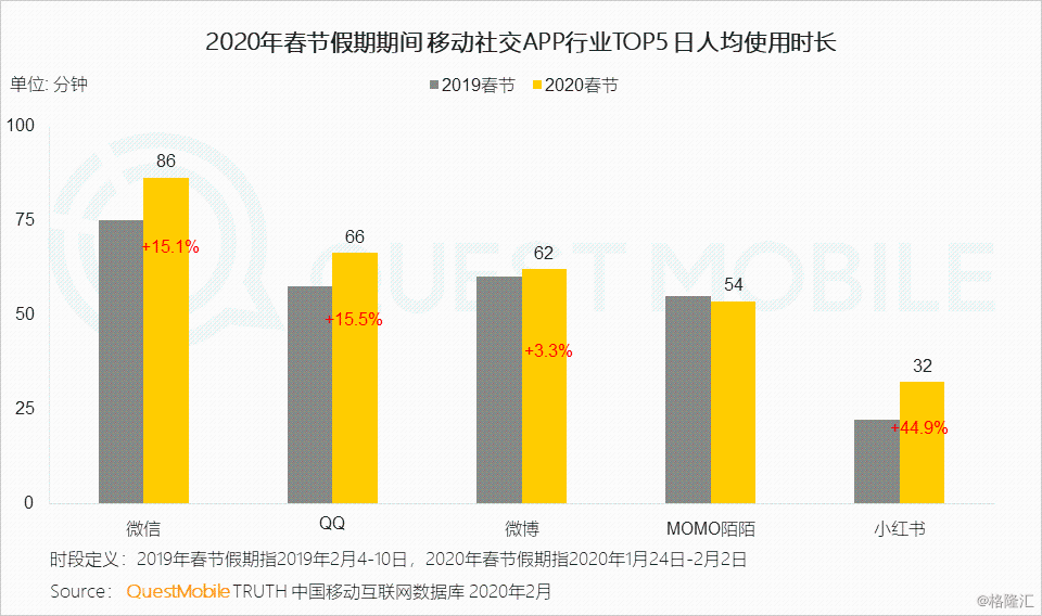 1.3 由于政府和民众对疫情信息的空前重视,用户在微信和QQ中获取信息、关心家人,月人均使用时长均上涨15%以上