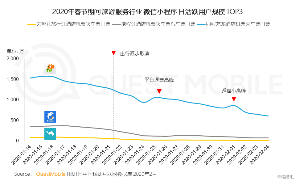 11.3 典型旅游服务微信小程序和APP趋势类似, 1月22号以后政府逐步推出“少出门”宣传和政策,网民出行逐步取消,同程艺龙在春节期间出现退票小高峰,2月初迎来返程小高峰