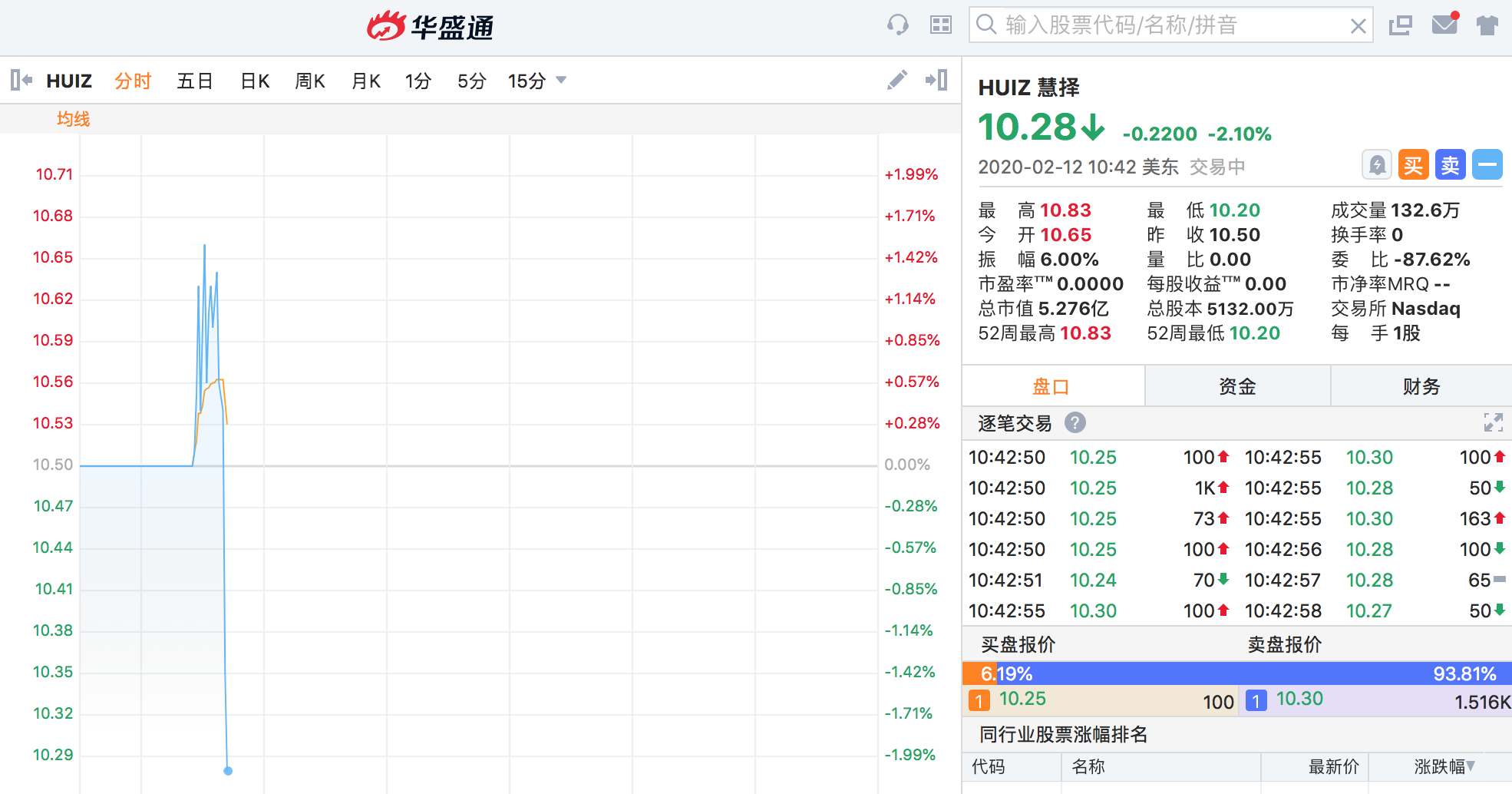 华盛资讯2月12日讯,慧择保险今晚正式登陆美国纳斯达克,股价小幅高开后转跌,截至美东时间10:42,较发行价10.5美元下跌2.1%,成交量132.6万股,最新市值5.276亿美元。