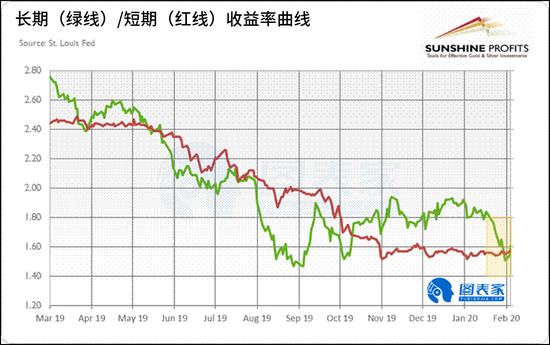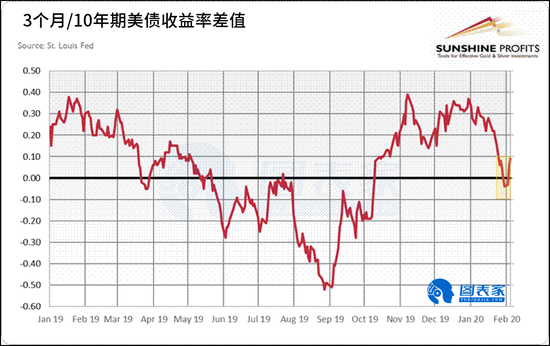 图为3个月和10年美国国债收益率息差的走势图,可以看到在1月和2月之交,息差再次跌至零以下,但仅仅只有几天就再次回升至零之上。