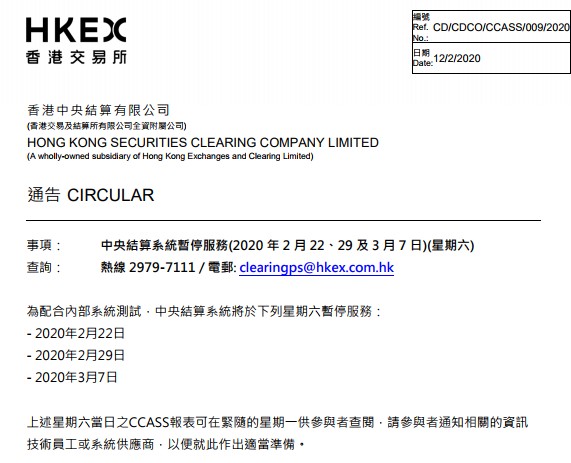 港交所(00388)今日(2月12日)发布通告表示,为配合内部系统测试,中央结算系统将于下列星期六暂停服务:2020年2月22日、2020年2月29日、2020年3月7日。