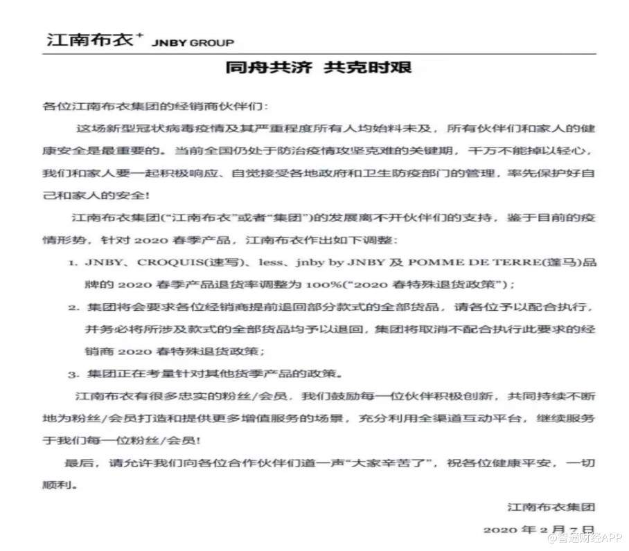 智通财经APP注意到,2月7日,江南布衣在对集团经销商伙伴的信中称,鉴于疫情形式,针对2020年春季新品,江南布衣将对旗下包括JNBY、CROQUIS(速写)、less、jnbybyJNBY及POMMEDETERRE(蓬马)品牌的2020春季产品退货率调整为100%(“2020春特殊退货政策”),集团将会要求各方经销商提前退回部分款式的全部货品。